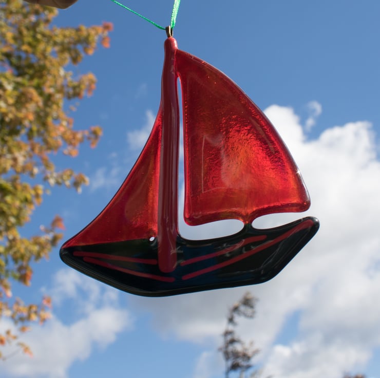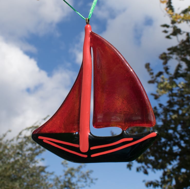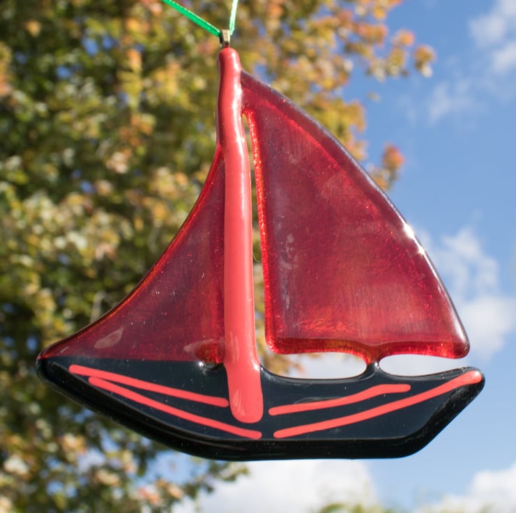 He's made of 3 pieces of hand-cut glass with a glass mast. We assembled the pieces in the kiln and fired it up to around 800C to fuse everything together. Once cooled we glue on a bail and thread a piece of ribbon to hang it from.