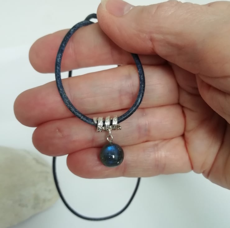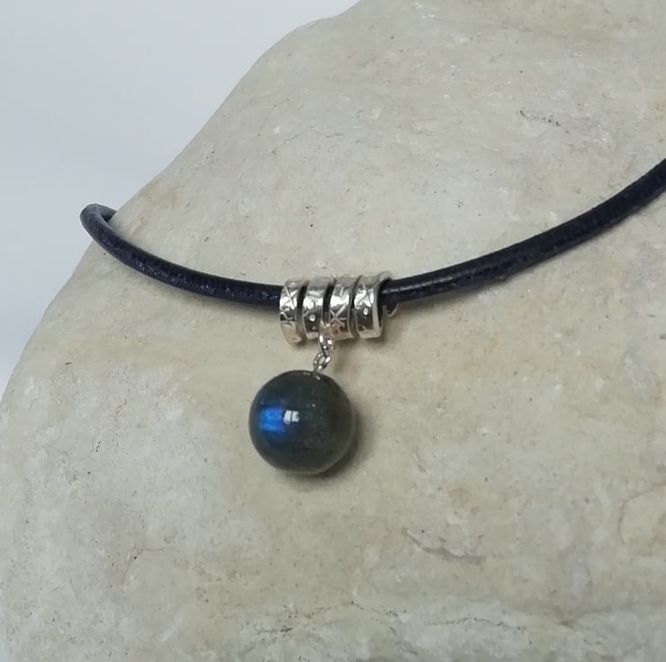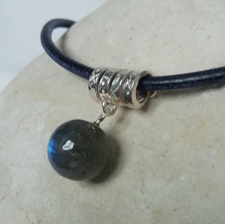 This is a 10 mm polished labradorite ball which has shades of grey and green, but flashes of electric blue when it catches the light. A stunning stone. It is suspended from a silver spiral which is stamped with crosses and dashes. The pendant is hung on a 45 cm navy blue leather thong.