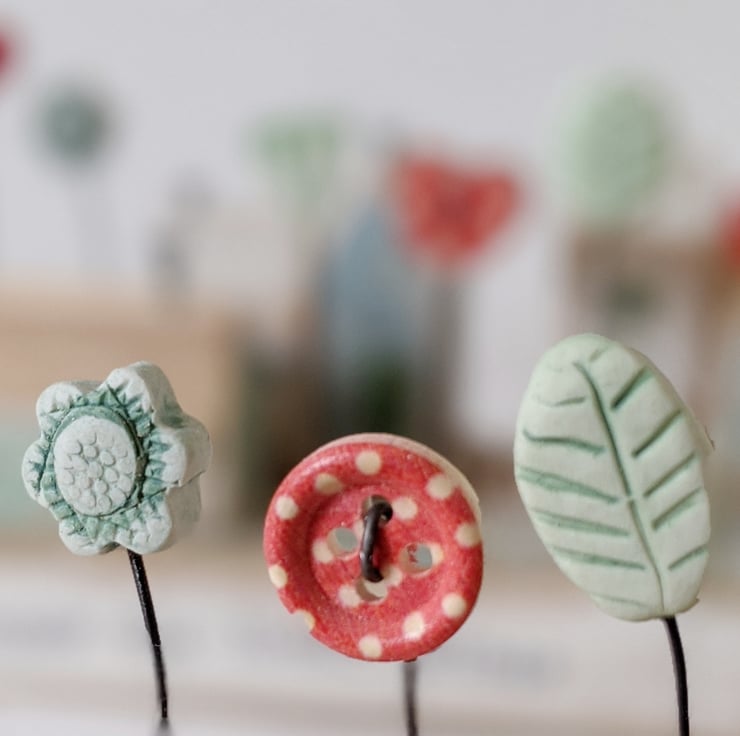 The little tree and flower are handmade from polymer clay, shaped, fired and painted to finish.