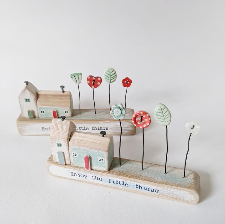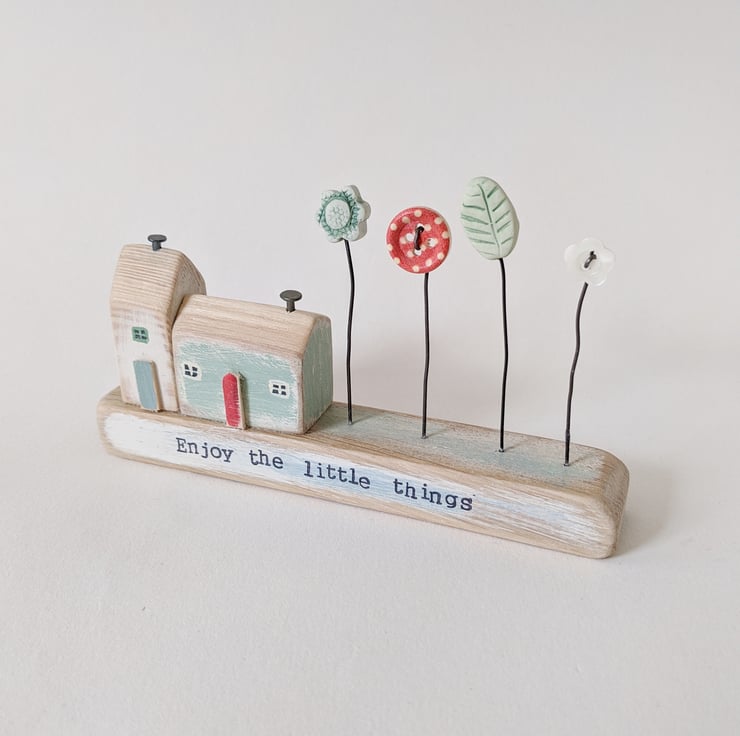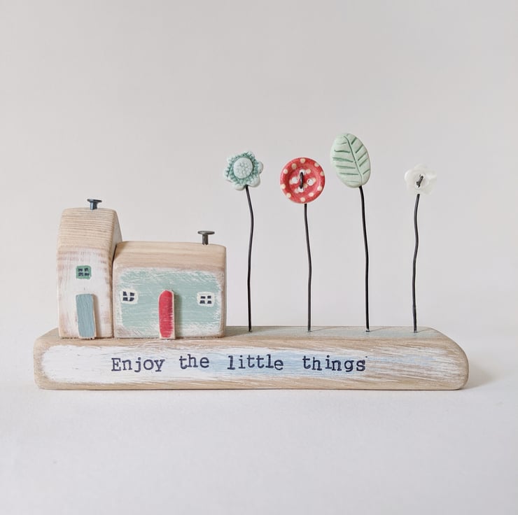 They sit on a painted wooden block and on the front are the hand stamped words 'Enjoy the little things'.