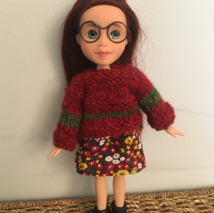 She has enjoyed a thorough spa treatment and had her hair de-tangled, washed and trimmed. Samantha has been cleaned and sterilised. Her face has been repainted by hand in non toxic paints and sealed to give her a fresh, natural look. Sam has a cute outfit, including a hand knitted top in red Rowan tweed yarn and a matching floral skirt. Her shoes are made from Silicone and pop on and off foot nubs.