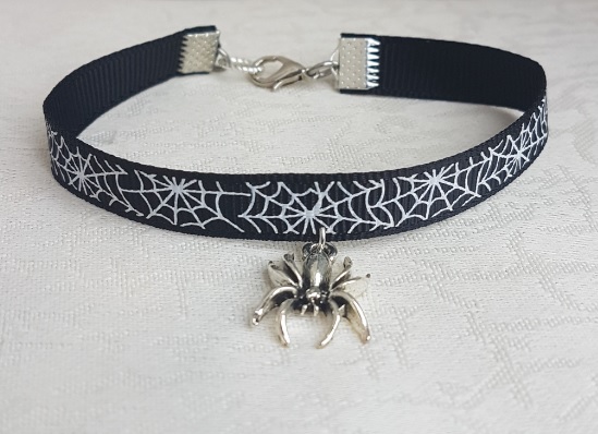 Gorgeous Ribbon bracelet with Spiderweb pattern and Spider charm. A creepy-cute and unusual bracelet. Fab as a Spooky gift or as part of your Halloween costume.