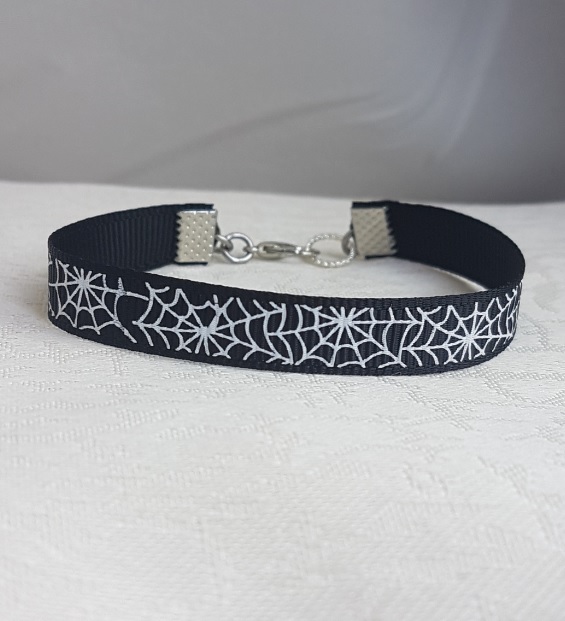 Gorgeously spooky spiderweb ribbon bracelet, a lovely black Grosgain ribbon with a white Spiderweb design, fastens with a trigger clasp. Great as a gift or as a treat for yourself.