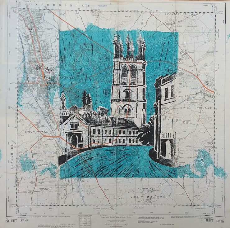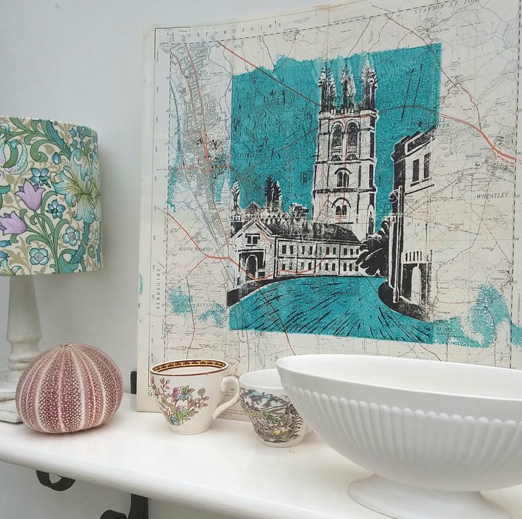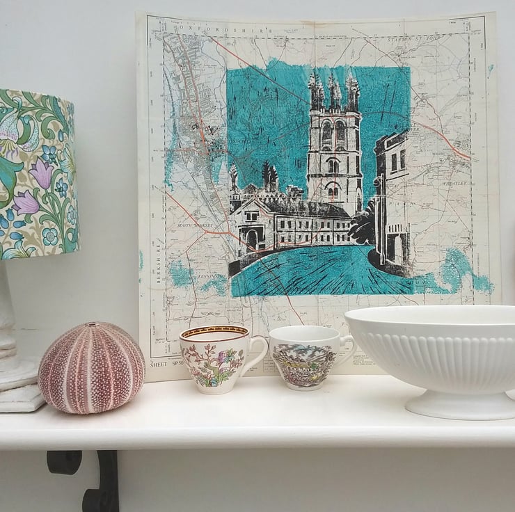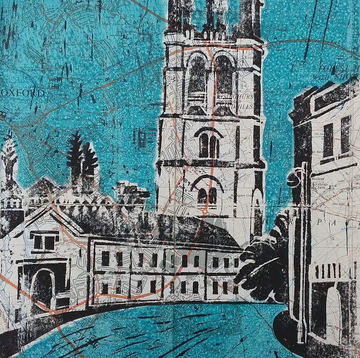 I live in one of the most beautiful cities in the world and so it was about time that I made some images inspired by the views and buildings I cycle through every day. I like combining and using different printing techniques and enjoy the blemishes and happy mistakes that may occur. I particularly like the creases that old maps can create. I print on a variety of papers and fabrics and for this piece I have used an old map of Oxford. The map includes Oxford city centre and areas to the East such as Wheatley and Kennington.