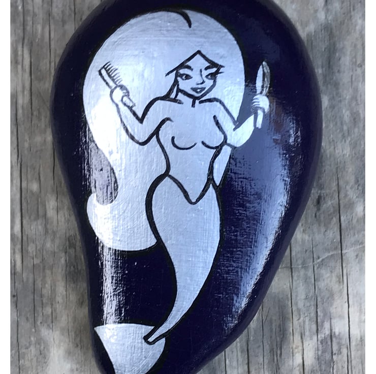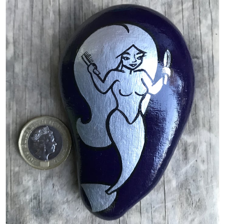 A mermaid brushing her hair painted in silver against Prussian Blue on a sea-worn Dorset beach stone.