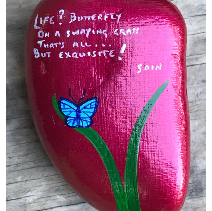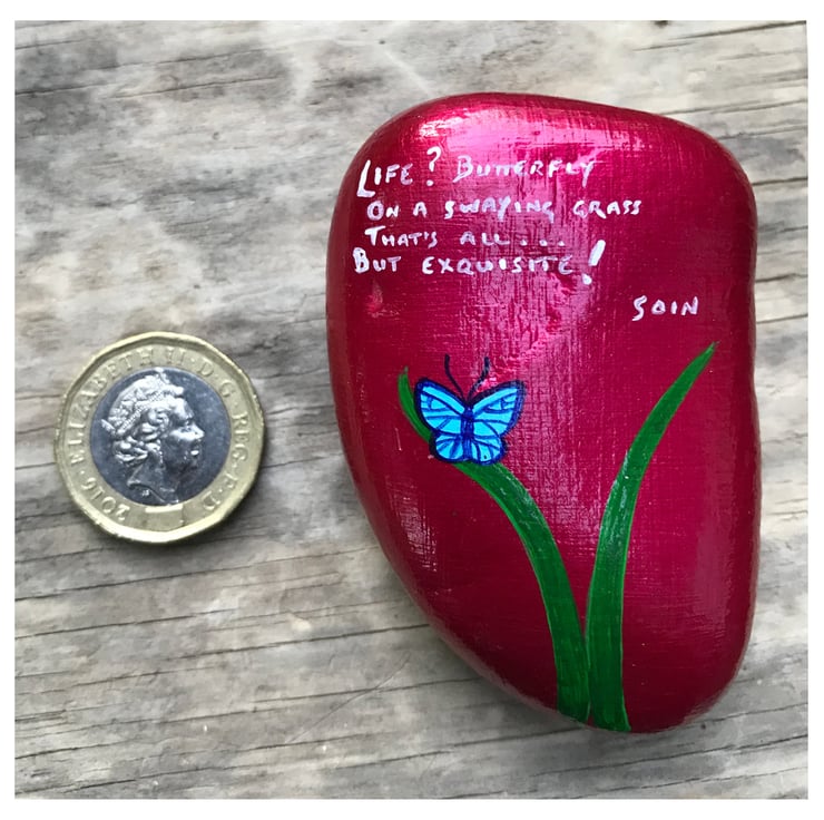 A translation of a Japanese poem by Soin painted on a sea-worn stone. The poem is in white on a metallic red background, with a small blue butterfly on one of two strands of grass.