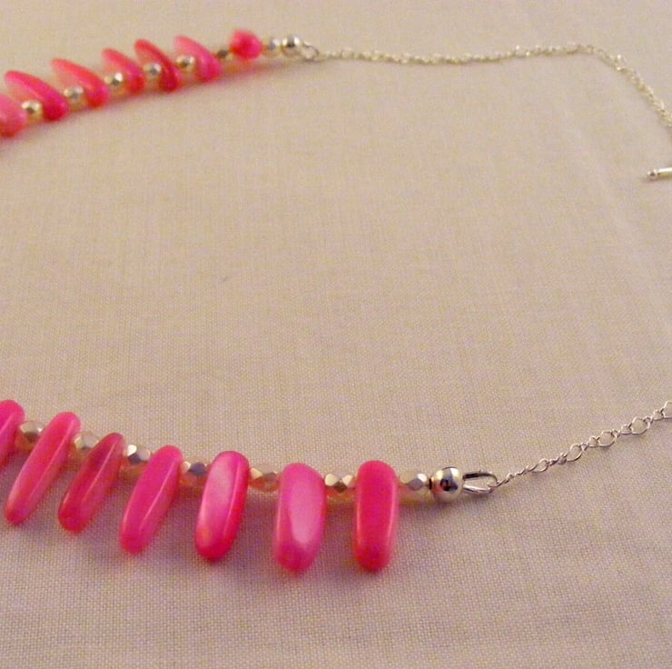 I've handmade this shell necklace using, fuchsia shell nuggets and 4 mm ivory colour Czech fire polish beads, which are threaded onto silver colour beading wire. Ends are finished with silver plated findings. Silver plated chain and toggle clasp are attached to complete the necklace.