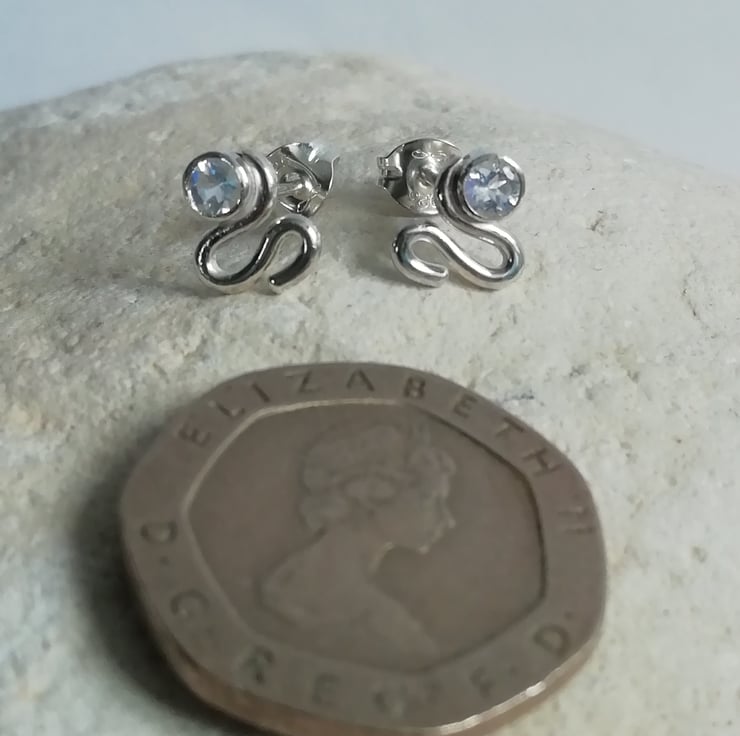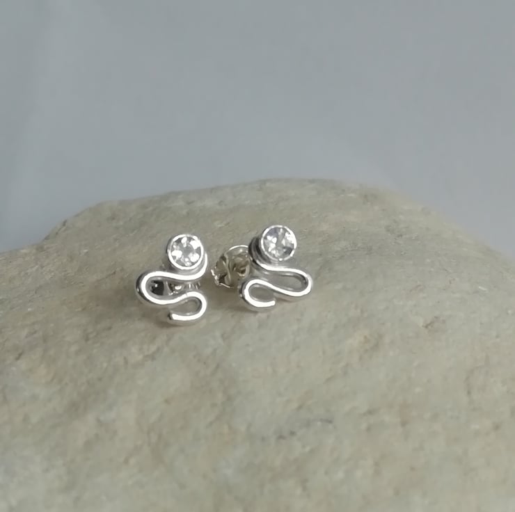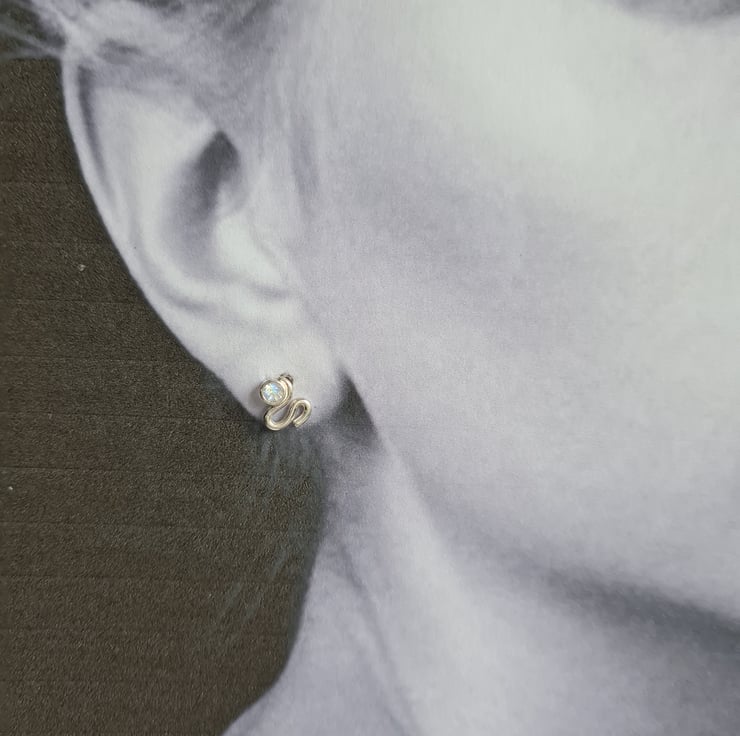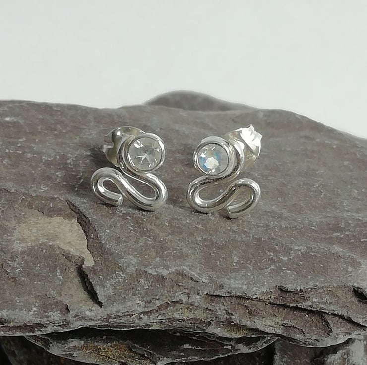 These handmade silver studs consist of a 4mm cut moonstone gem, set above a silver wire swirl. The stones are a milky white with flashes of blue.