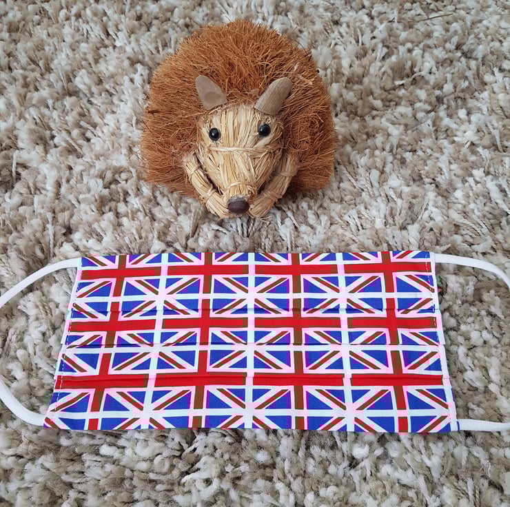Small Adult/Teenager face covering made from a Union Jack print. The face mask is made with 2 layers of cotton forming an inner pocket for a filter (not included) and is fastened over the ears with 2 loops of elastic and a toggle adjuster.