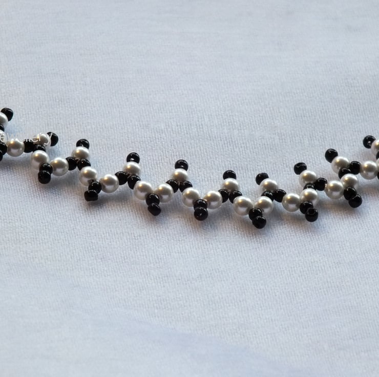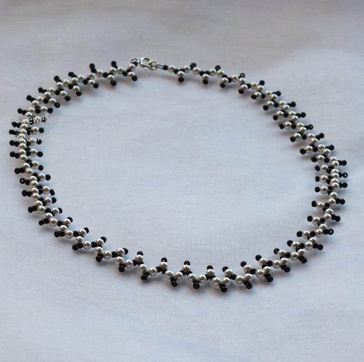 An unusual but delicate necklace made with 3mm white high end crystal pearls and black seed beads . It is fastened with a sterling silver bolt clasp.