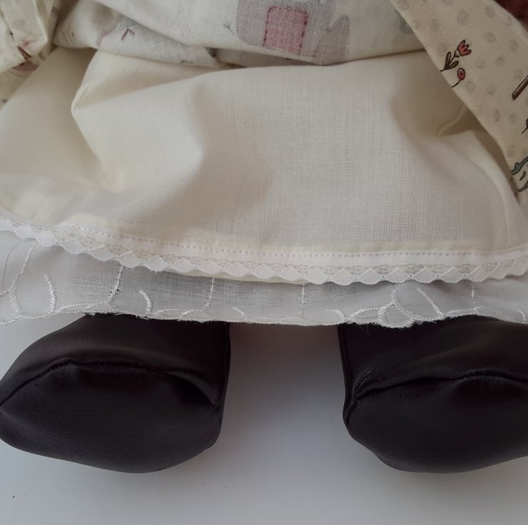 She wears a lovely Christmas design cotton dress from Anni Downs Christmas Wonderland collection fabric. An ivory petticoat edged with lace hangs below her dress.