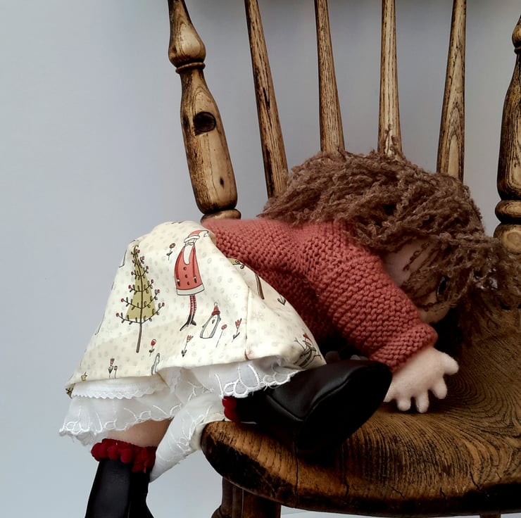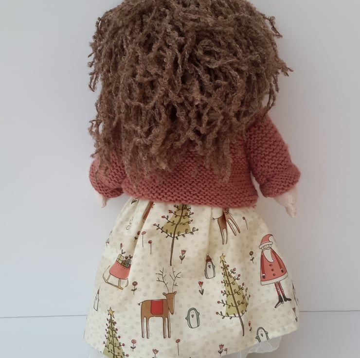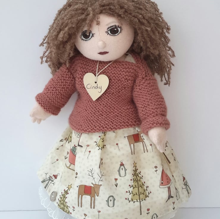 Cindy is a beautiful Christmas themed doll made from doll velour fabric in doll face pink.