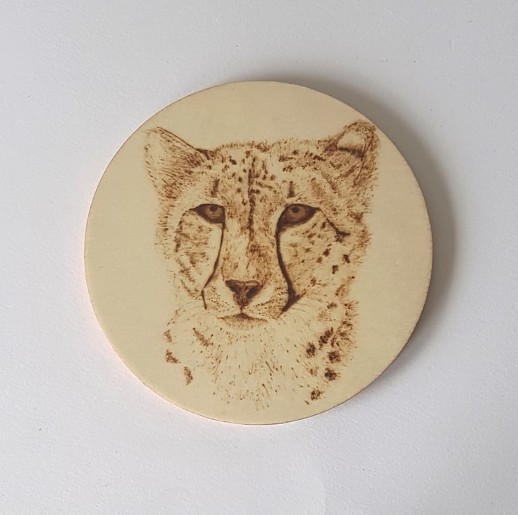 This particular Cheetah was in the Cheetah Sanctuary in South Africa when we capture his portrait on camera. The image has been drawn freehand from the photograph and individually burned into the wood.