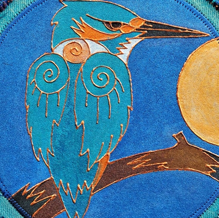 I love the iridescence of bird feathers and the kingfisher has such lovely colours to match the fabric paints that I use, I just couldn't resist making a few of these in altering shades of blue, turquoise and greens and that amazing splash of orange.