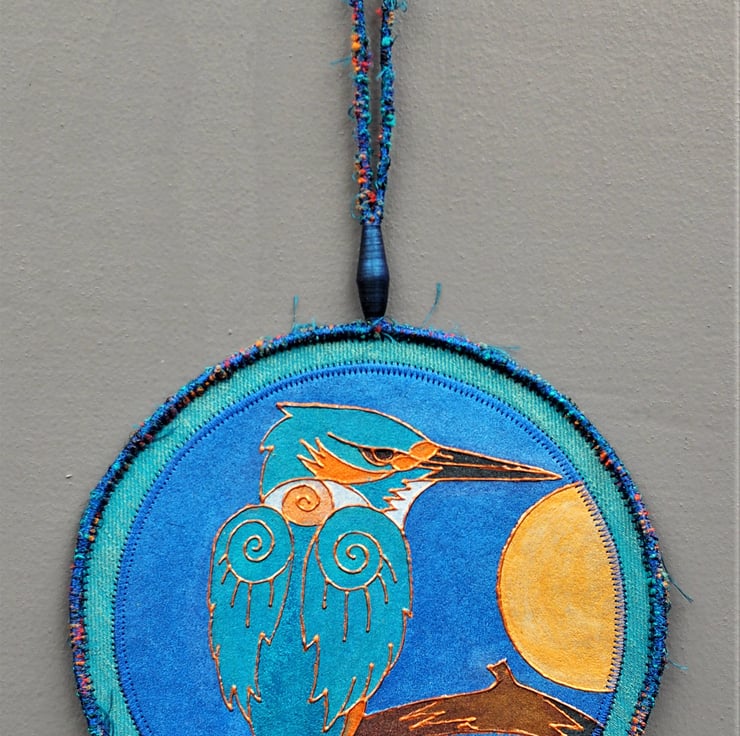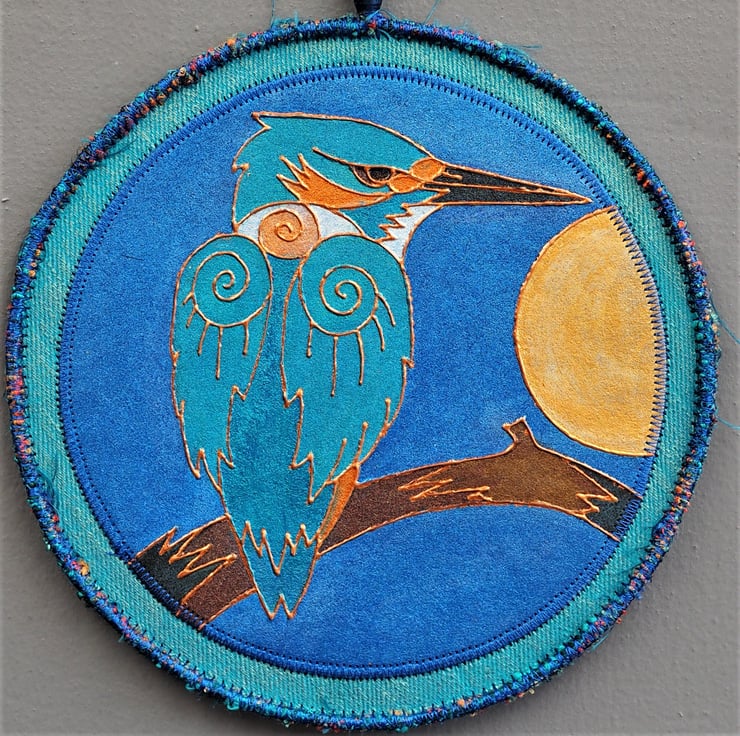 KMP001 - Kingfisher Mandala. Printed then painted fabric wall hanging. I cut my own lino then print and paint the finished design onto stiffened fabric. This one measures 17.5cm round plus mixed, stitched yarn edging and hanging loop with a handmade rolled, painted paper bead. Blue stitching. Plain black on reverse. Whilst fabric paints are colour fast, I would suggest it's hung out of intense or direct sunlight. Thanks for looking Vx