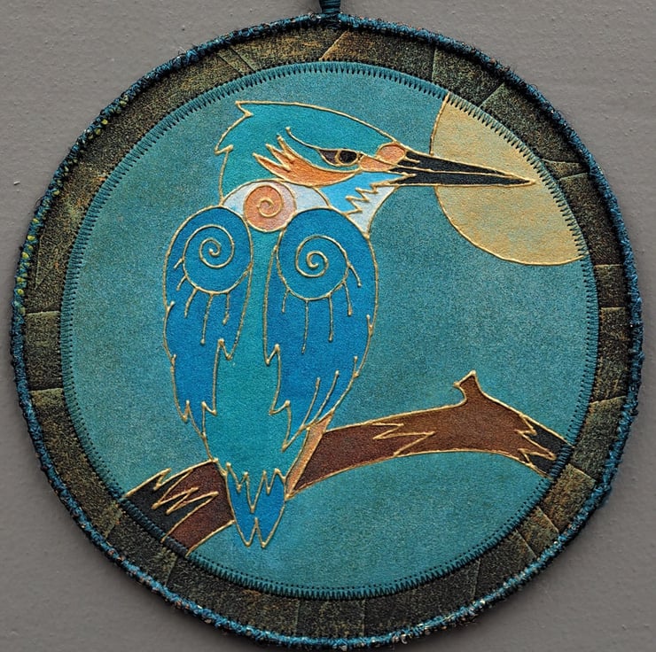 KMP002 - Kingfisher Mandala. Printed then painted fabric wall hanging. I cut my own lino then print and paint the finished design onto stiffened fabric. This one measures 17.5cm round plus mixed, stitched yarn edging and hanging loop with a handmade rolled, painted paper bead. Green stitching. Plain black on reverse. Whilst fabric paints are colour fast, I would suggest it's hung out of intense or direct sunlight. Thanks for looking Vx