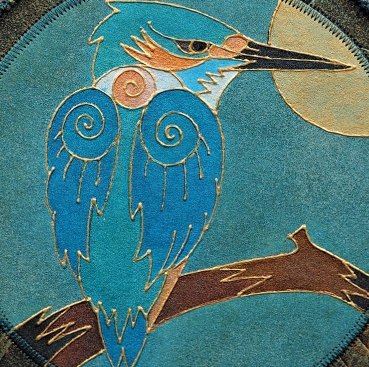 I love the iridescence of bird feathers and the kingfisher has such lovely colours to match the fabric paints that I use, I just couldn't resist making a few of these in altering shades of blue, turquoise and greens and that amazing splash of orange.