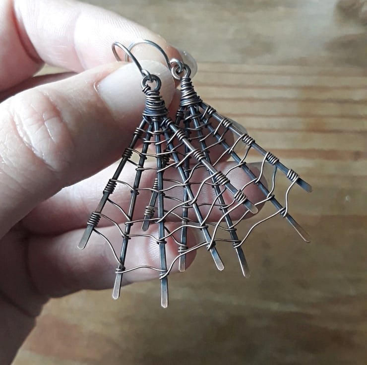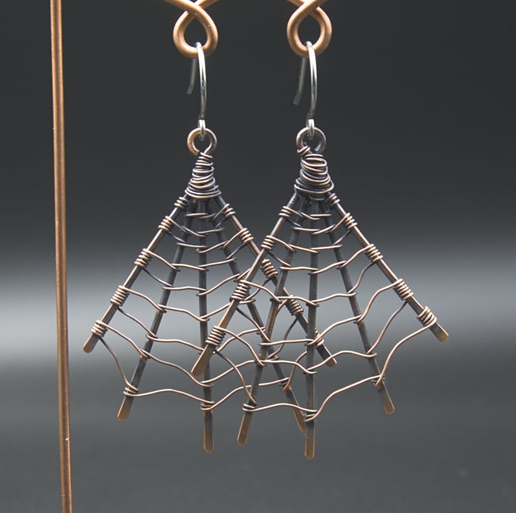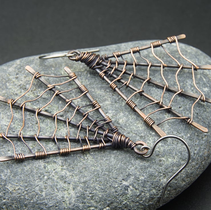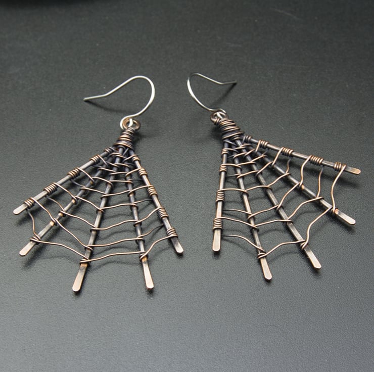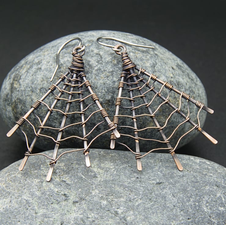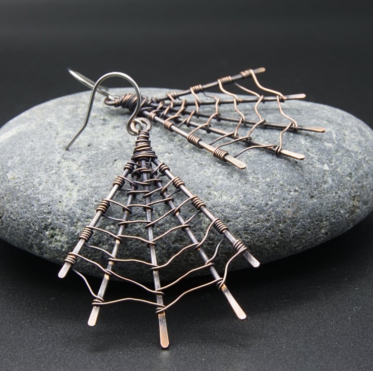 These fab spider web earrings have been completely handmade from copper wire. I've formed the five main struts of the web from thicker wire, hammering them flat & rounding off the ends. The web has been created by wrapping fine wire around these struts to form a section of hanging web for each earring. I've oxidised the finished earrings to almost black, & then lightly polished just to highlight the web pattern. These funky earrings would make a great gift for a spider fan, or could be the perfect addition to your Hallowe'en outfit!