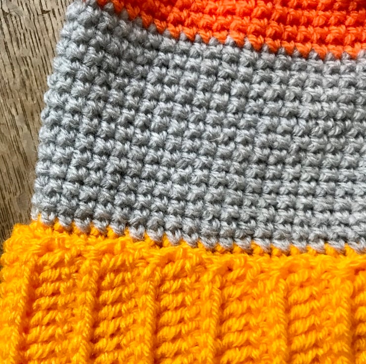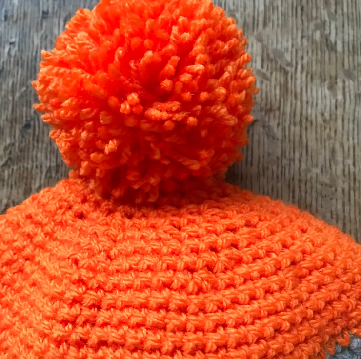 A bold statement of a hat in vibrant orange and yellow Sandwiched around light grey. Completely eye catching with a folded brim to keep little ears extra warm and a super pom-pom on top.