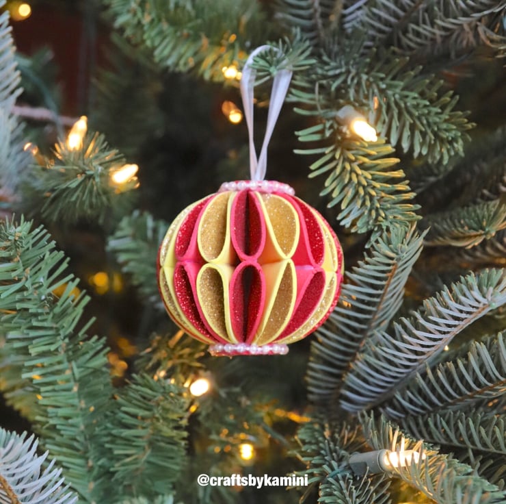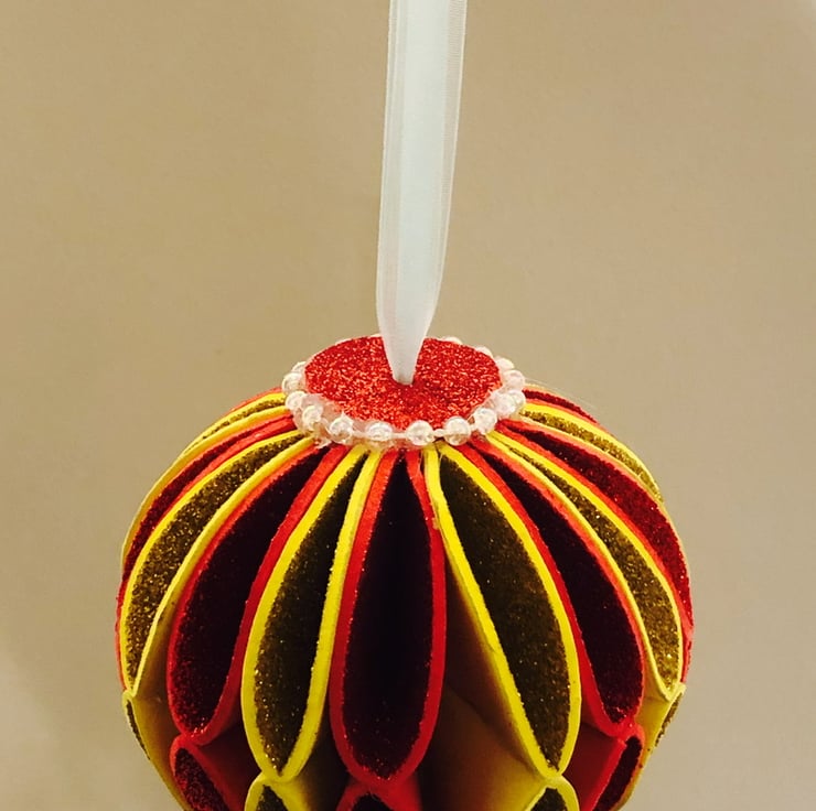 This bauble is approximately 26.5cm circumfrence and approximately 8cm high. It's made from red and gold glitter foam and is light weight.