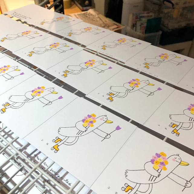 'Skating Bird with Flowers' is an original hand screen-printed 5 colour single fold card. It is a limited edition and I have only printed 48 cards with this design.