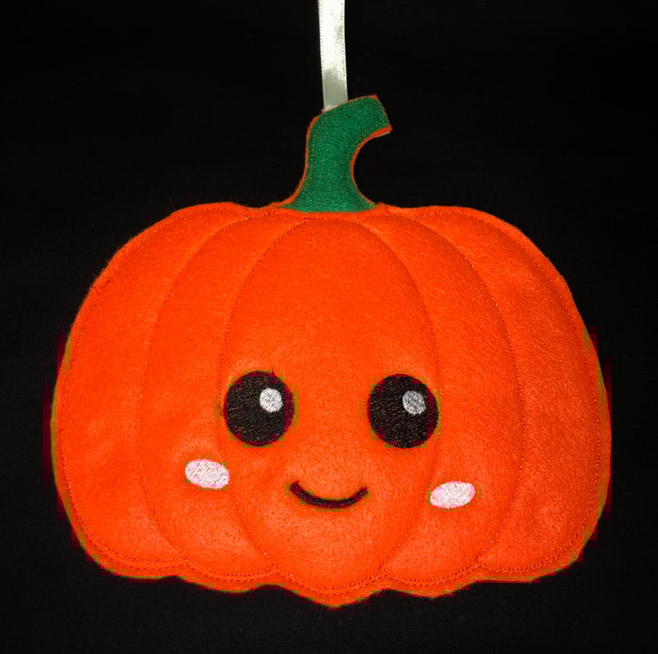 This listing is for one Halloween Pumpkin decoration. This pumpkin measures 20 cm round and is made from felt with a ribbon hanger.