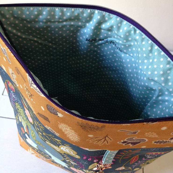 Featuring moon gazing bunnies front and back paired with a gorgeous autumnal print and a teal polka dot lining.