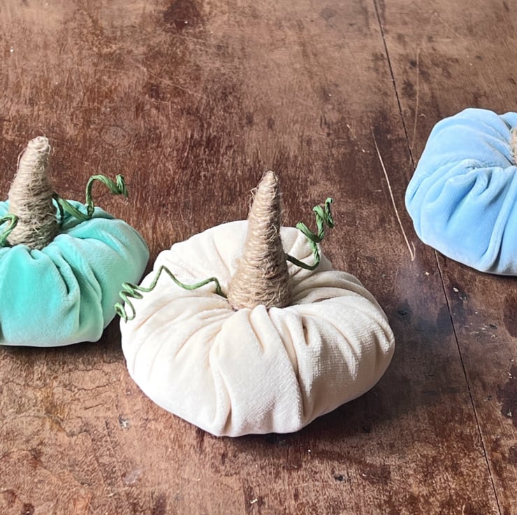 These lush fabric pumpkins are hand sewn using cotton thread in my humble craft room in Manchester. It is stuffed with polyfibre to give it volume. The branch is handmade from paper and twine glued to the top of the pumpkin. An extra touch of curly twine wrapped in green paper completes this velvety decor.