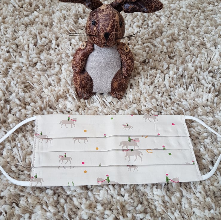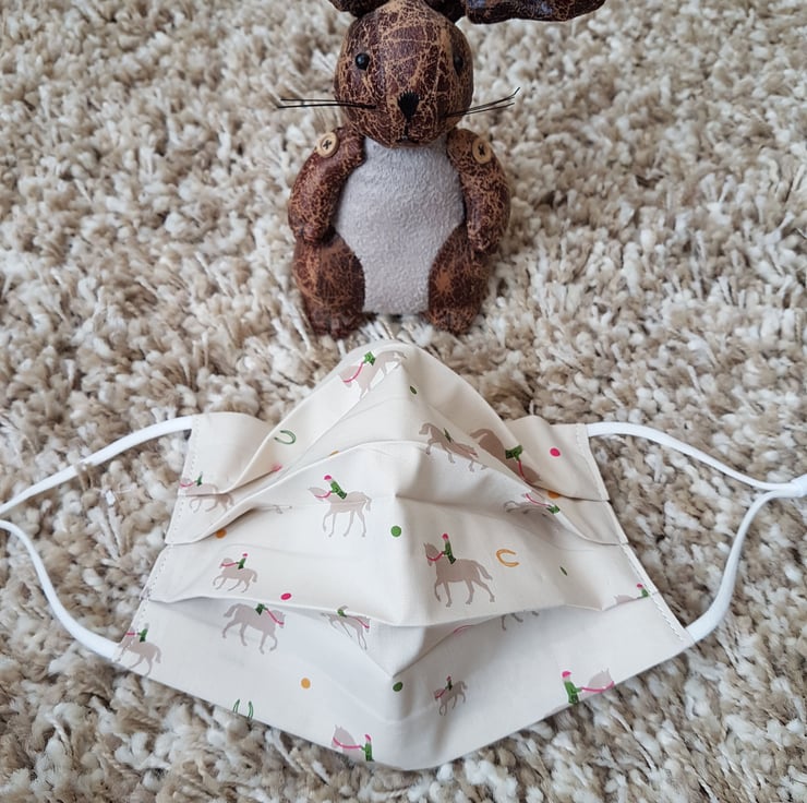 Adult face covering made from a horse and jockey print on cream cotton. The face mask is made with 2 layers of cotton forming an inner pocket for a filter (not included) and is fastened over the ears with 2 loops of elastic and a toggle adjuster.