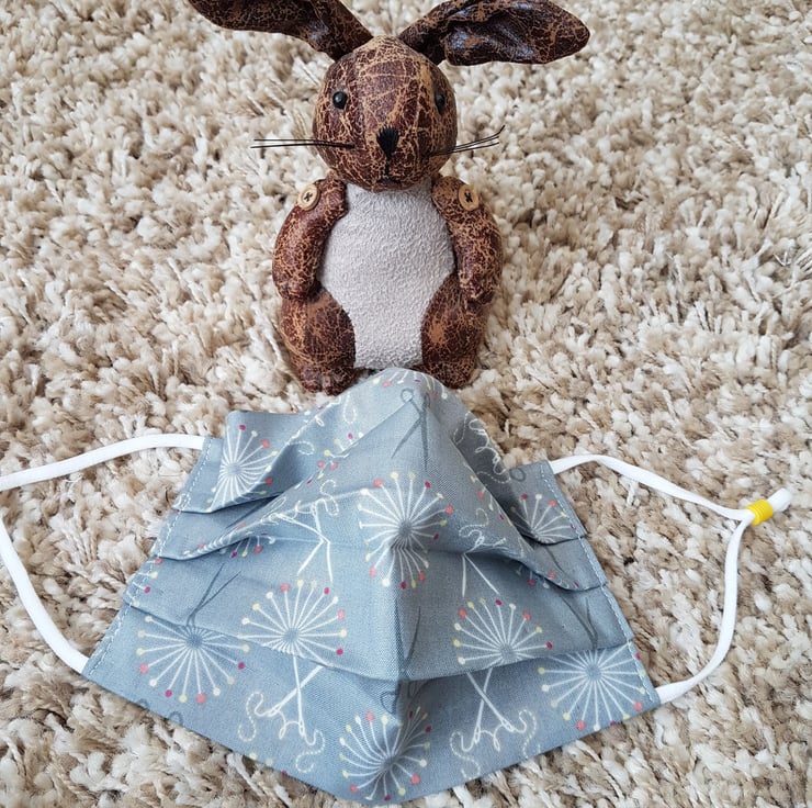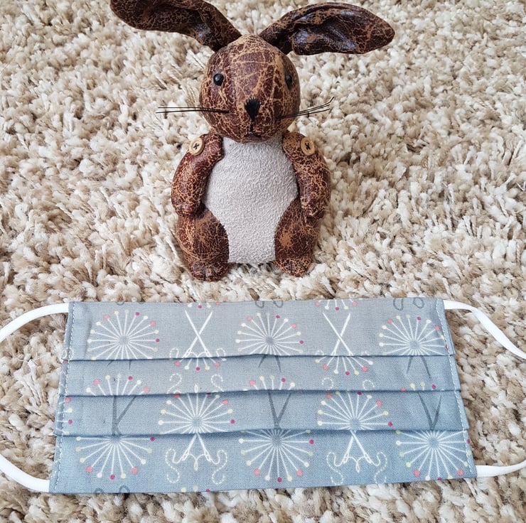 Adult face covering made from a pins and needles print on grey cotton. The face mask is made with 2 layers of cotton forming an inner pocket for a filter (not included) and is fastened over the ears with 2 loops of elastic and a toggle adjuster.
