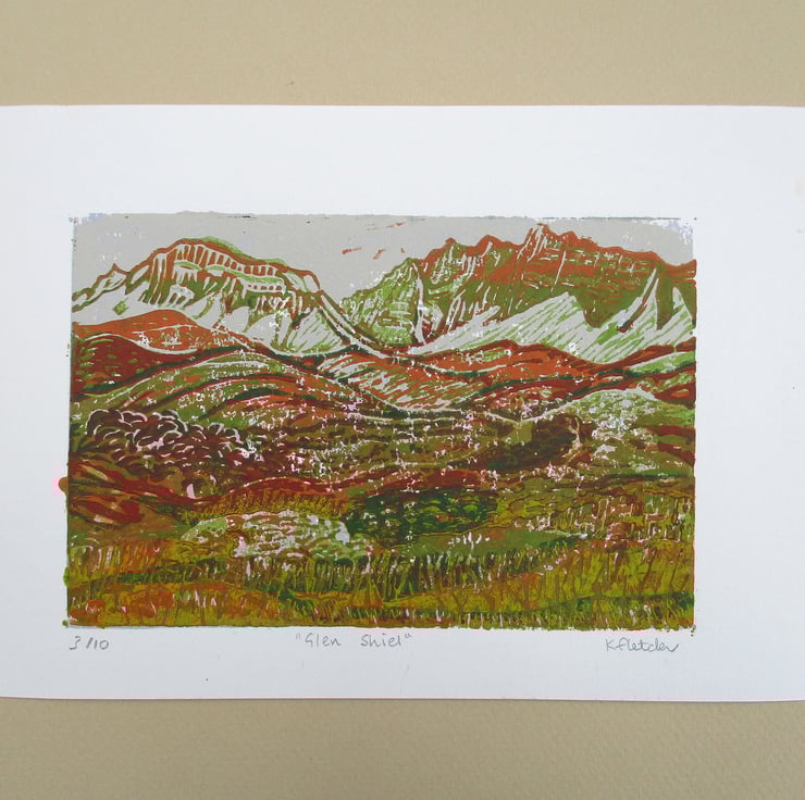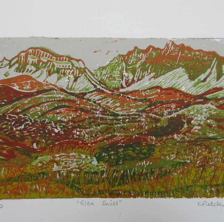 This original hand pressed linocut print portrays the dramatic landscape of Glen Shiel in the Scottish Highlands. It is based on photographs I took while visiting the area during the month of September.