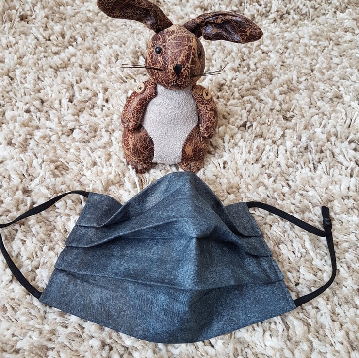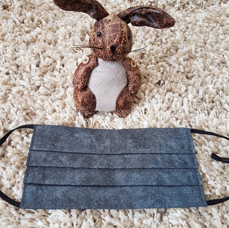 Adult face covering made from a charcoal grey mottled cotton. The face mask is made with 2 layers of cotton forming an inner pocket for a filter (not included) and is fastened over the ears with 2 loops of elastic and a toggle adjuster.