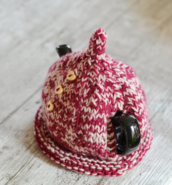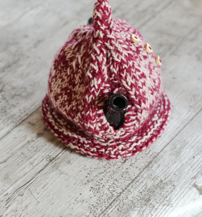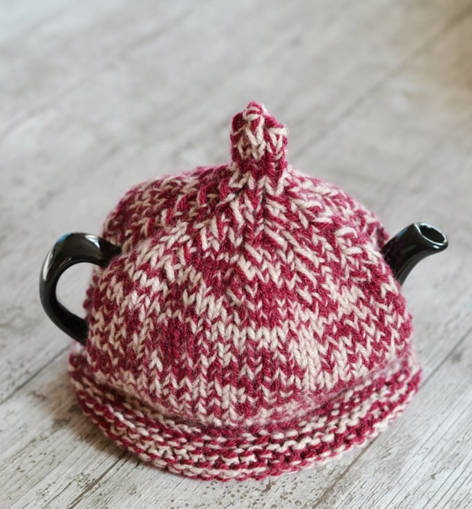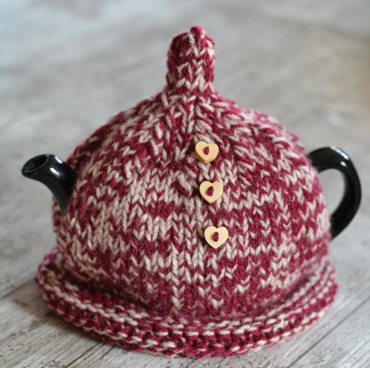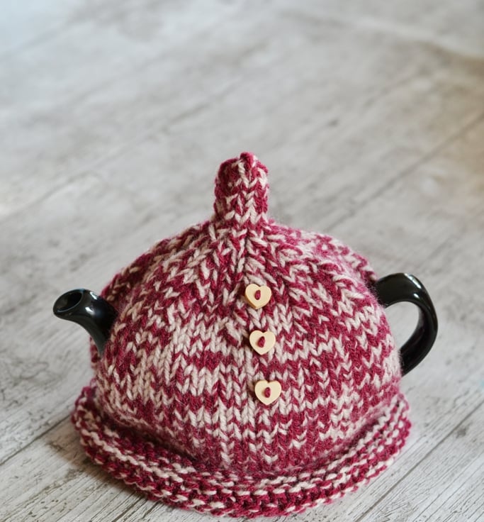 Chunky knitted teapot cover. Made in one of my own patterns. It looks as though the teapot is on a tray.