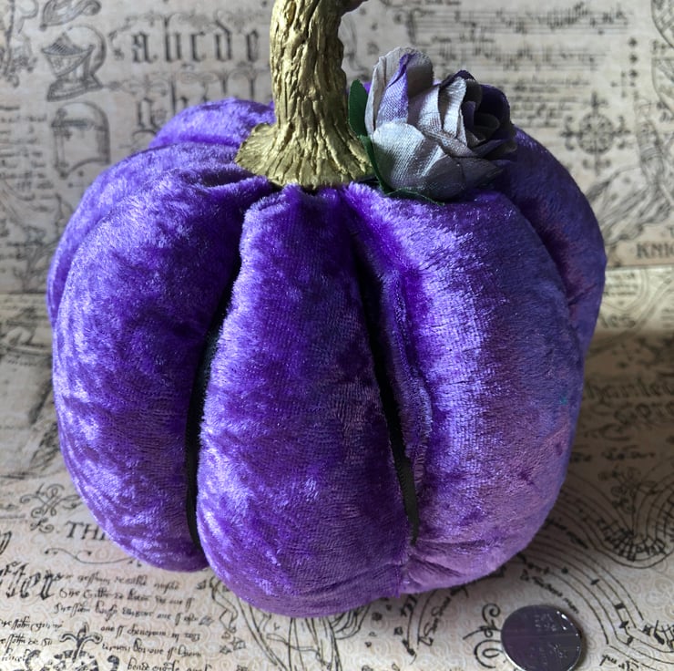 This beautiful crushed velvet pumpkin measures 15cm x 13cm.