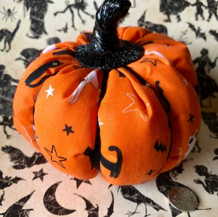 Orange cotton pumpkin with a lovely black and white witches cat print.