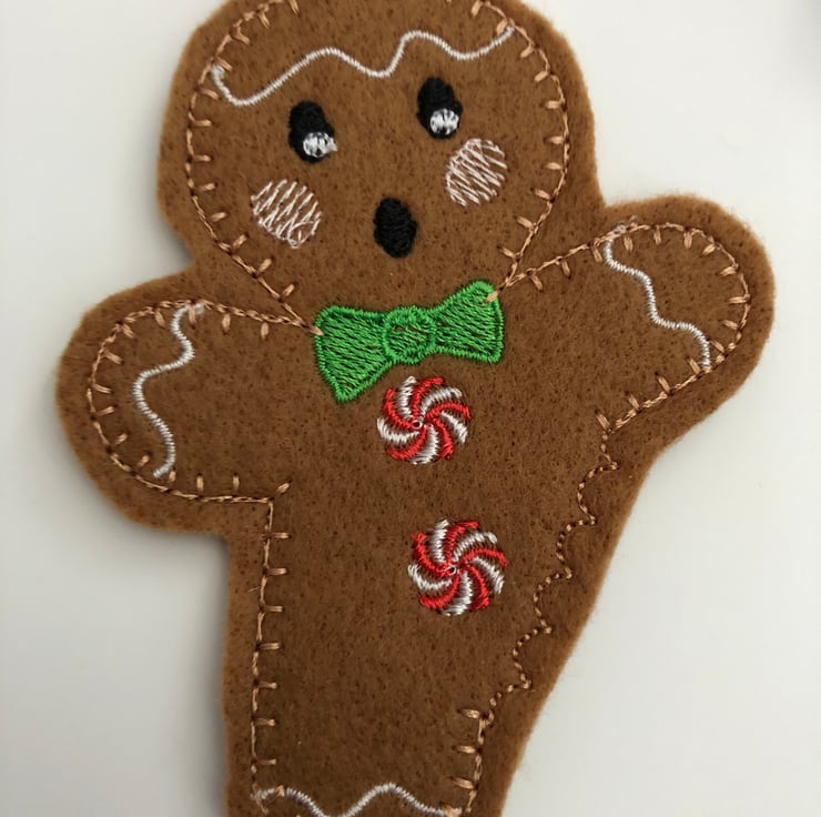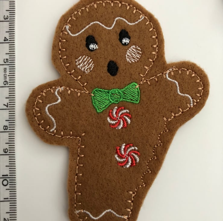 This listing is for 1 ginger bread person with a bite taken from it’s leg. He is made from felt with a ribbon hanger.