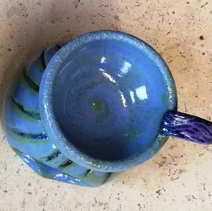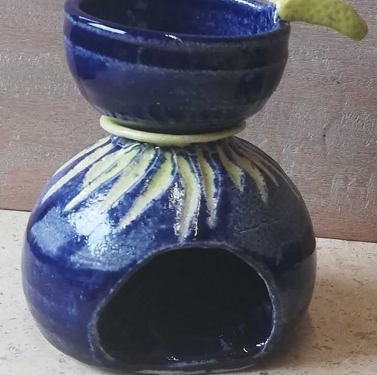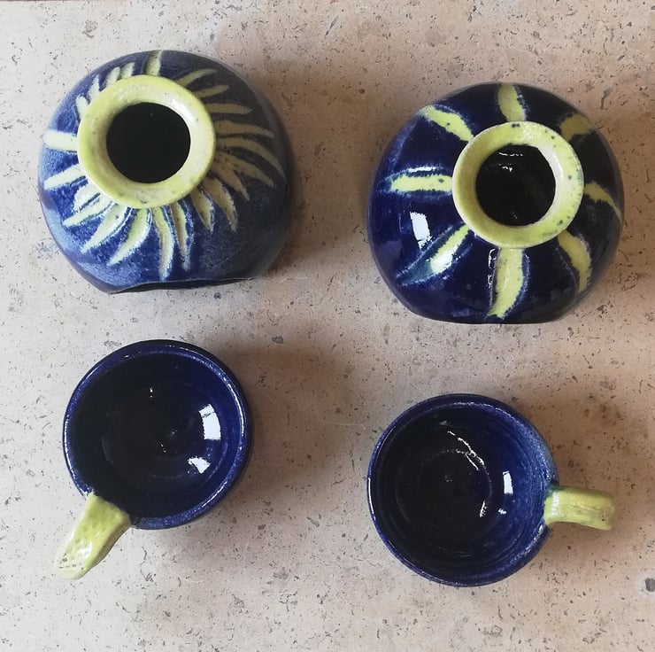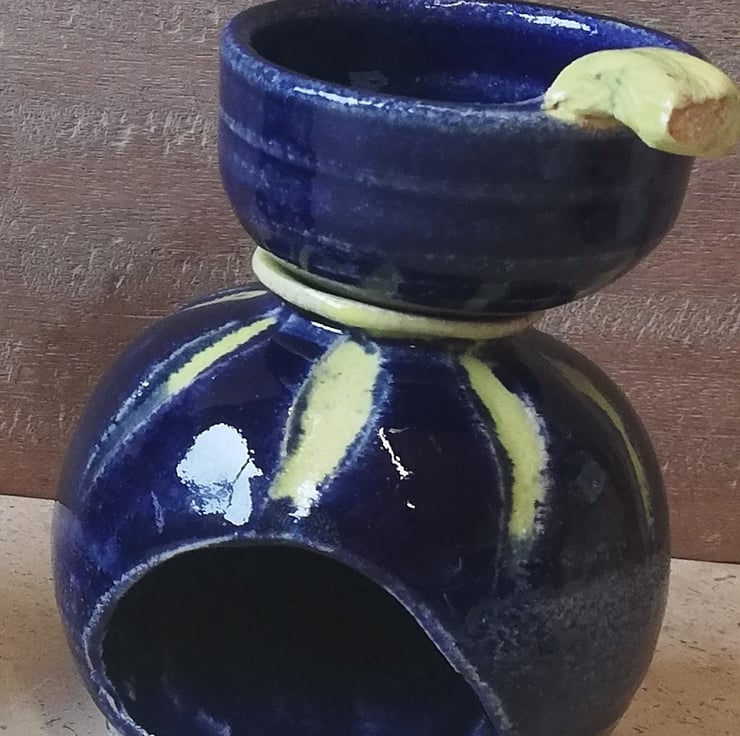 Glossy dark blue glaze with yellow scoring decor around top neck.