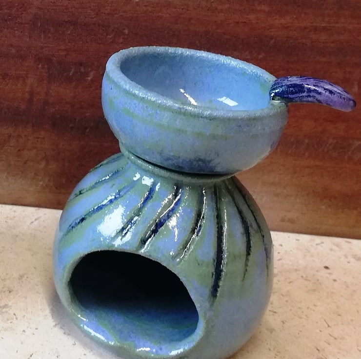 OB 3: Blue green glazed oil burners with scored decor around the top neck. Bowls with small handles, purple.