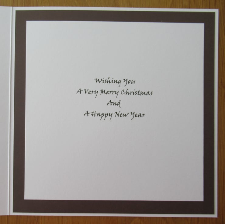 A lovely 7x7 inch card in blues which features a squirrel eating hazelnuts whilst being watched by a robin. There are multiple layers including a silver mirror mat to frame the image which is raised with 3D foam pads. There is a red organza bow to embellish the card and the inside is finished to coordinate with a christmas greeting as pictured.
