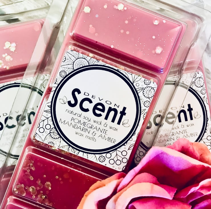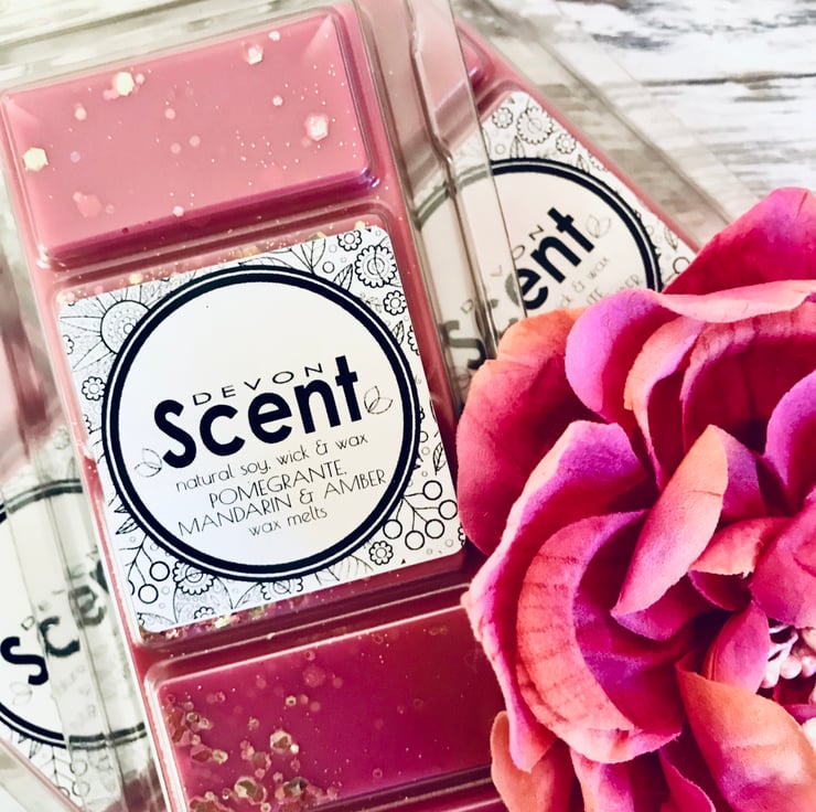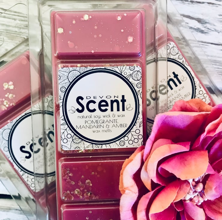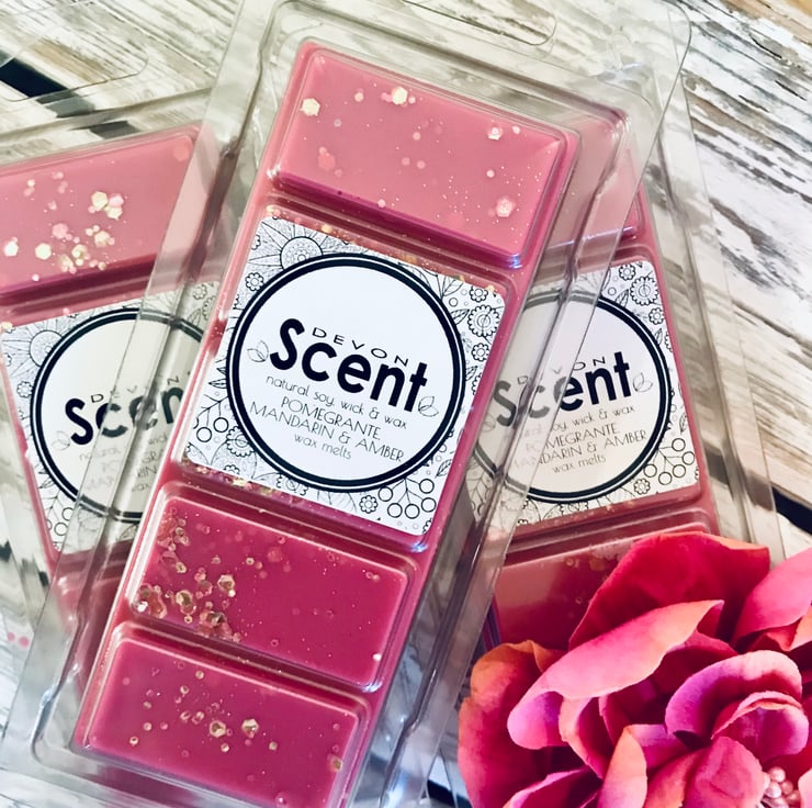 The scent from our Pomegranate, Mandarin & Amber Snap Bar Soy Wax Melts have a rich woody amber accord opening with fruity top notes of mixed berries, enhanced by white floral notes of Jasmin and lily, with spicy accents descending onto a rich base of amber, woods and musk.