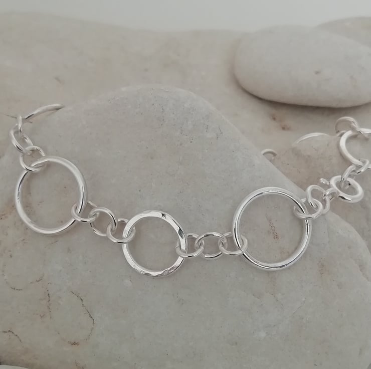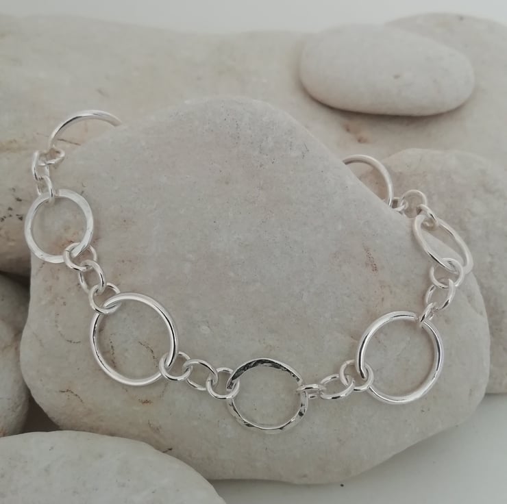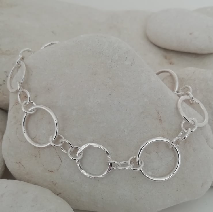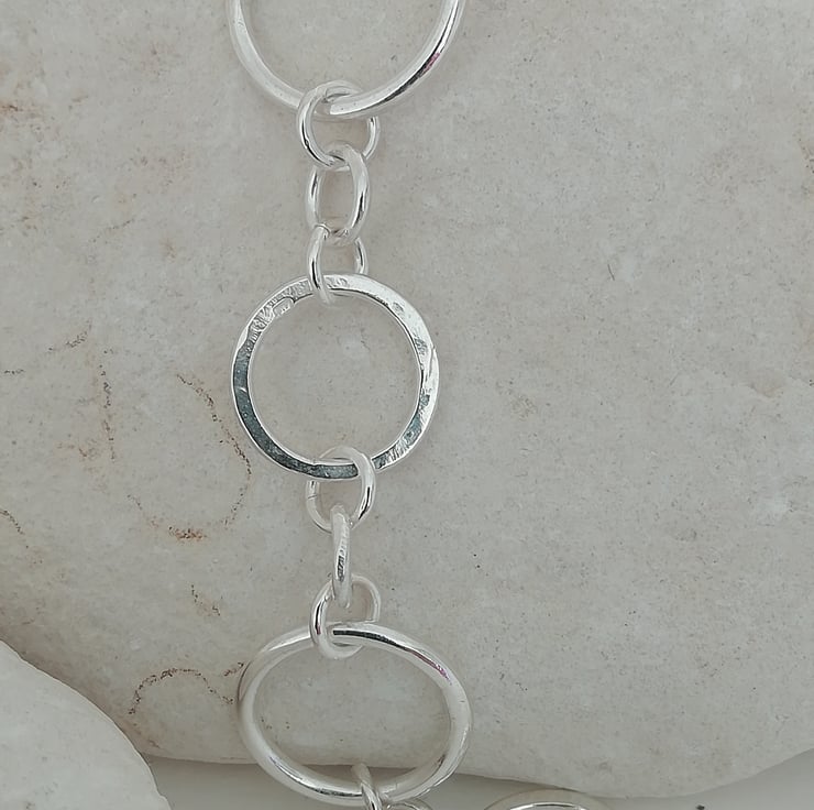 I have made this bracelet from large 12mm rings of round silver wire and slightly smaller 10mm rings which have been flattened and textured with a hammer. The rings are alternated along the chain and connected by 3 small silver rings. The bracelet is 18cm long which is perfect for a 16cm wrist size. It is a classic, easy to wear design.
