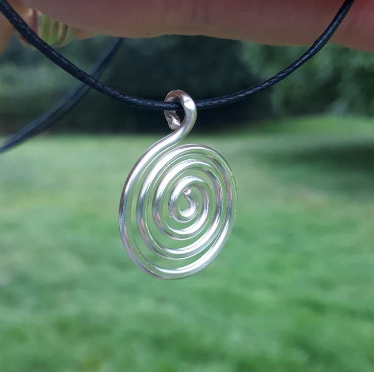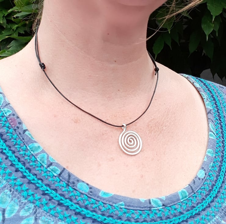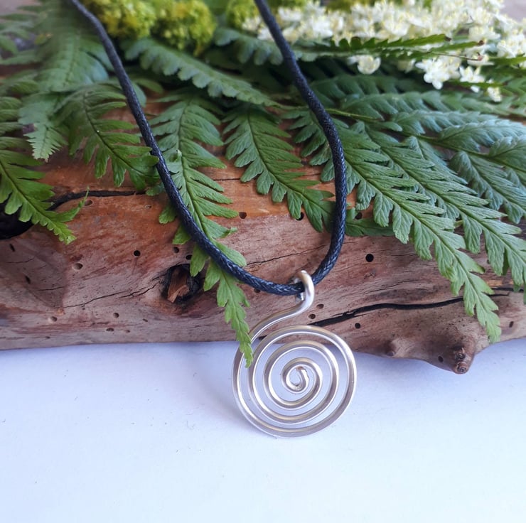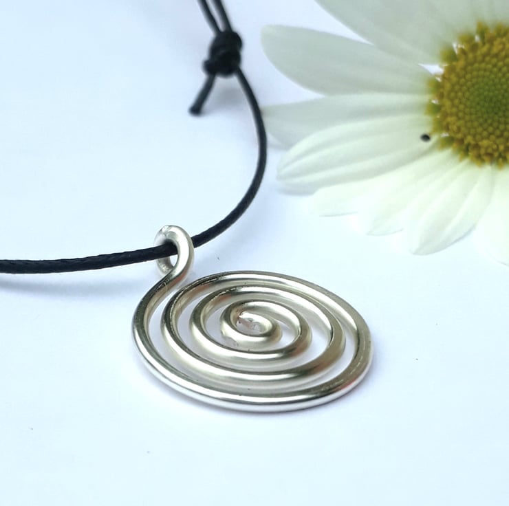 A simple silver spiral is hung from an adjustable black wax cord, to make this stylish silver spiral pendant, which is perfect for every day wear, for both men and women.