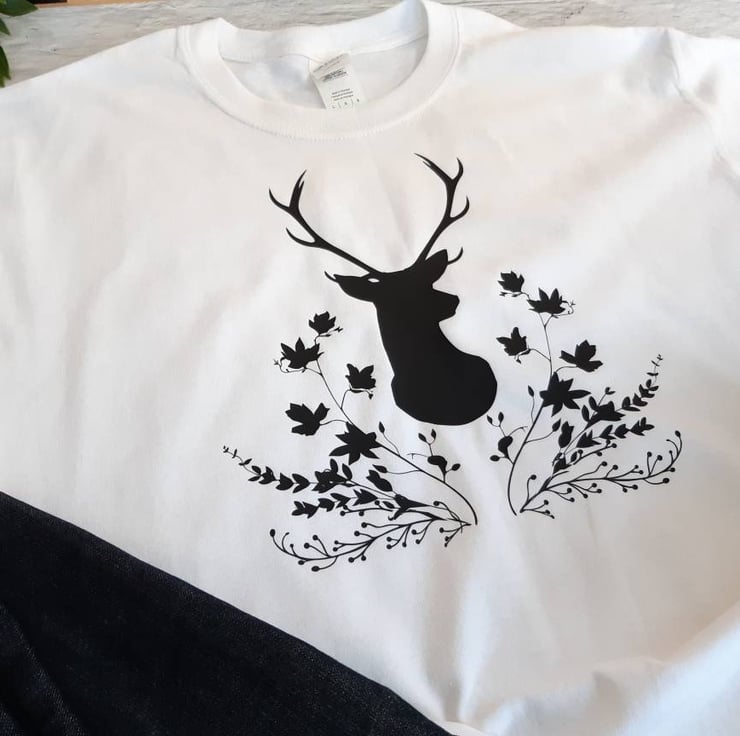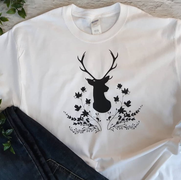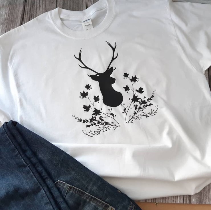 A unique design of a Stag and a foliage wreath (only available from us) has been heat pressed with vinyl on to a good quality 100% cotton Gildan t-shirt to make this stunning unisex t-shirt.