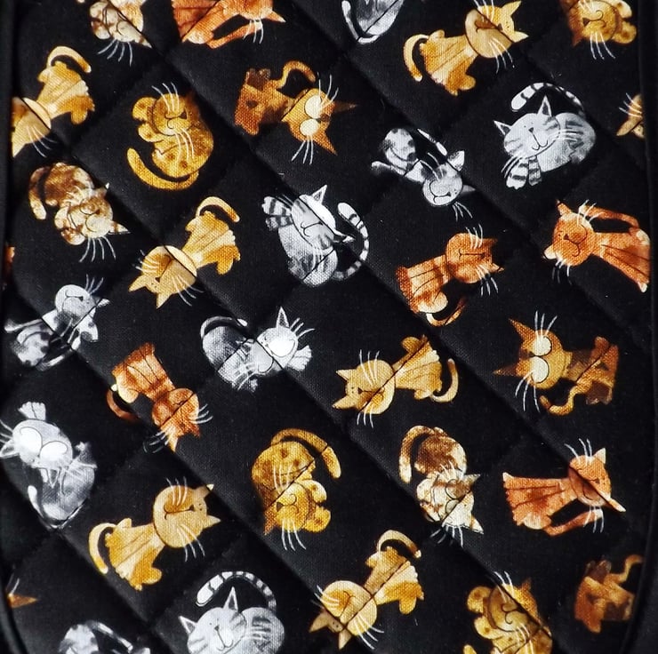 The main fabric has a black background with a cats design in shades of brown, gold and grey, with a contrasting cotton fabric in a terra cotta red with a subtle design of birds and leaves.
