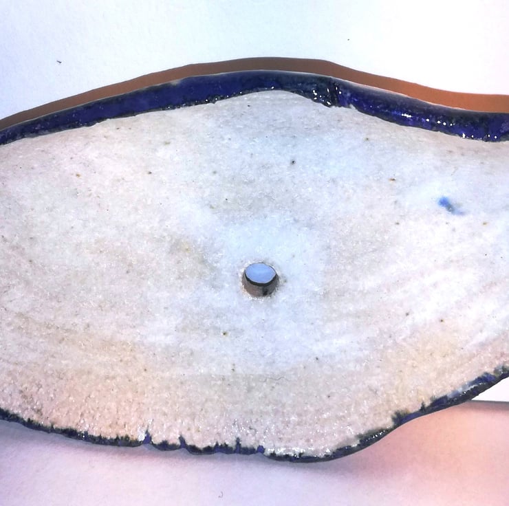 SS14 a narrow, white glazed with blue edge, shell shaped dish with one drain hole. Has 3 small leaf feet to stand