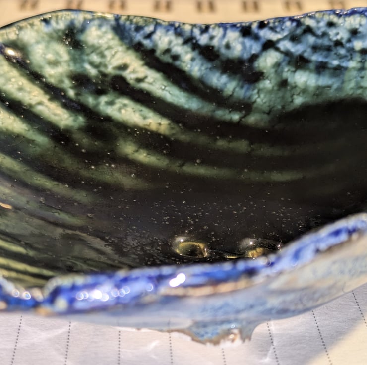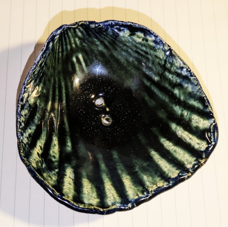 DGGS deep glossy green shell dish, mottled blue underside, 2 drain holes, 2 ivy leaf shaped feet/stand. Measures 9cm x 9cm, 2.5cm at the deepest point.