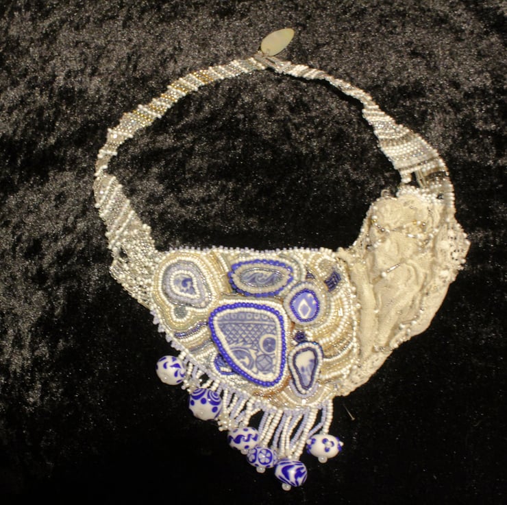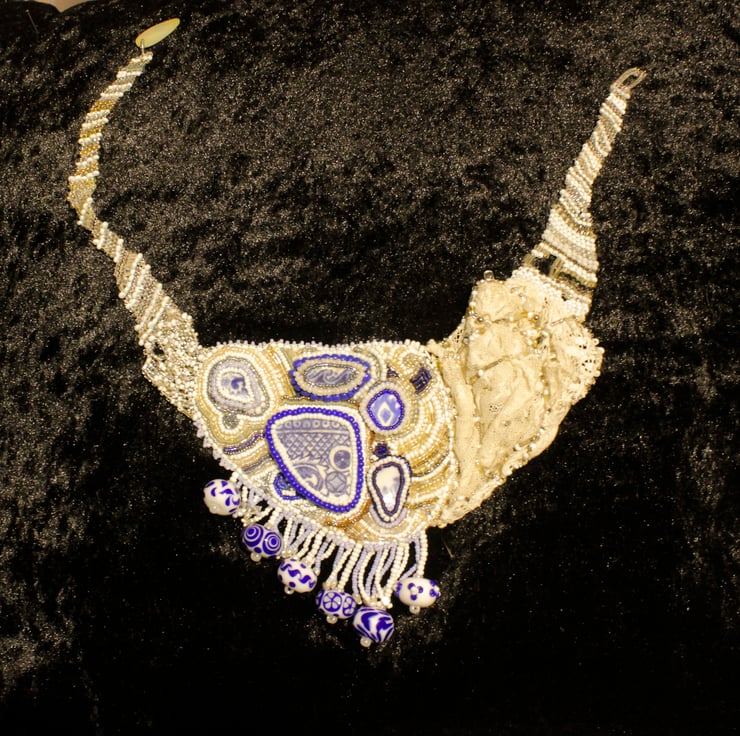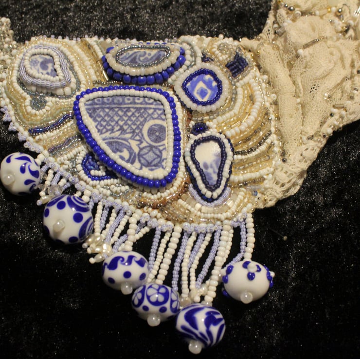 A large very unusual necklace made with 5 pieces of blue and white beach ceramic mounted on a plaque and beaded around using a mix of modern and vintage beads. The plaque has a piece of vintage lace attached to the left side (as worn) the lace has beaded embellishments and is finished with a length of bead weaving which narrows to the fastening loop. The other side has a bead woven section to complete the necklace, the fastener is a mother of pearl leaf shape. Suspended below the plaque are 6 hand made lampwork beads I bought from a lady at a country fair in Cornwall. In between these beads are strands of tiny seed beads. A very dramatic piece of jewellery which could be ideal for a bride with her own style.