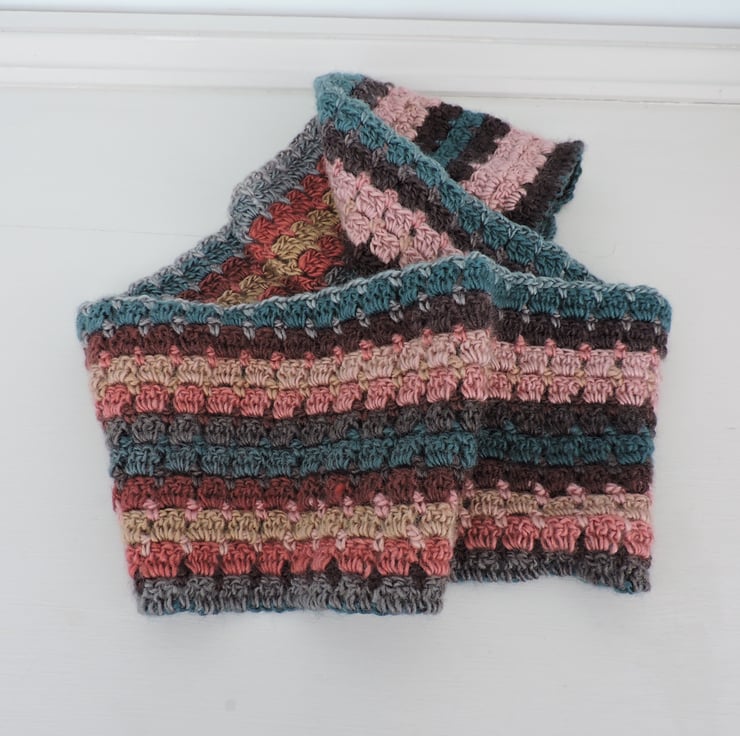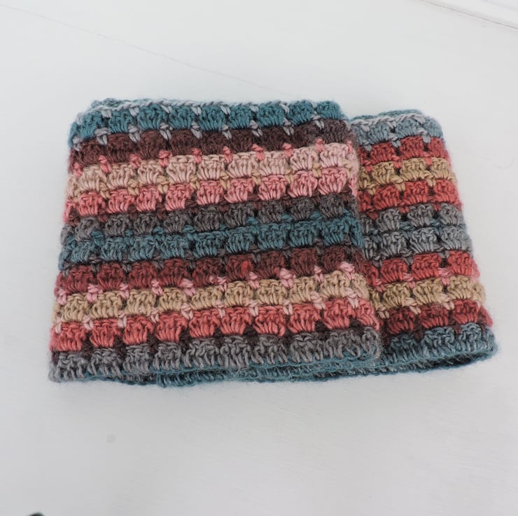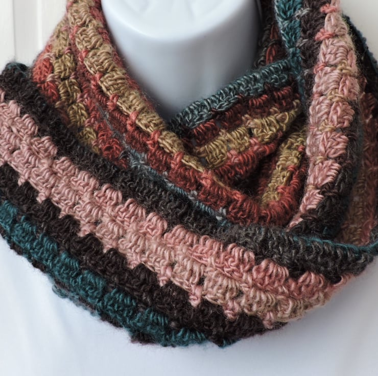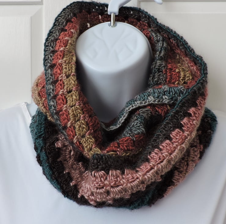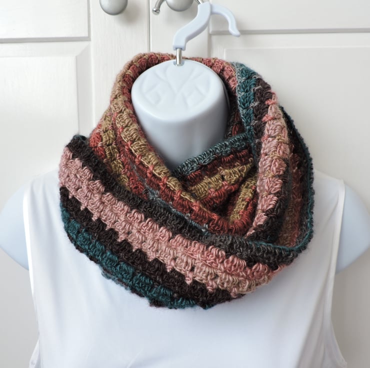 This colourful infinity scarf, circular scarf has been crocheted with a double knit graduated acrylic and wool yarn. Graduated colours of teal, salmon pink, light pink. taupe, russet and grey. A lovely winter warmer, wear it long or wrapped twice around your neck to make a snood and keep you snug and warm.