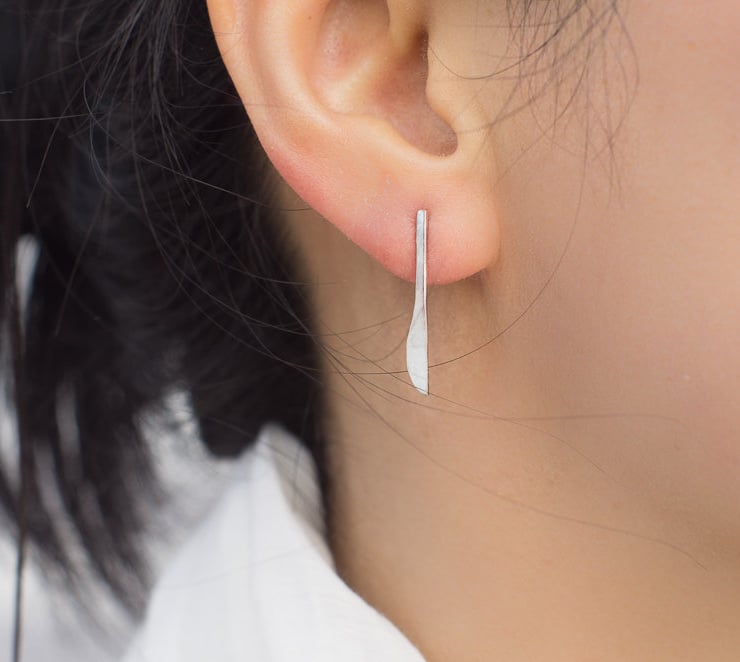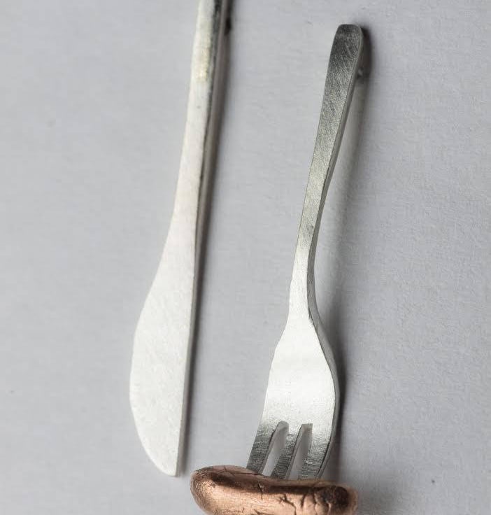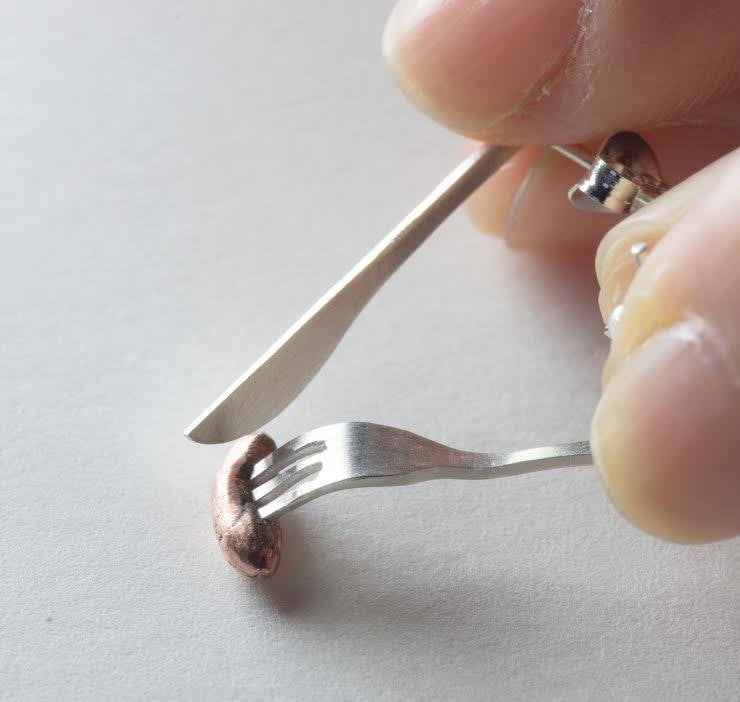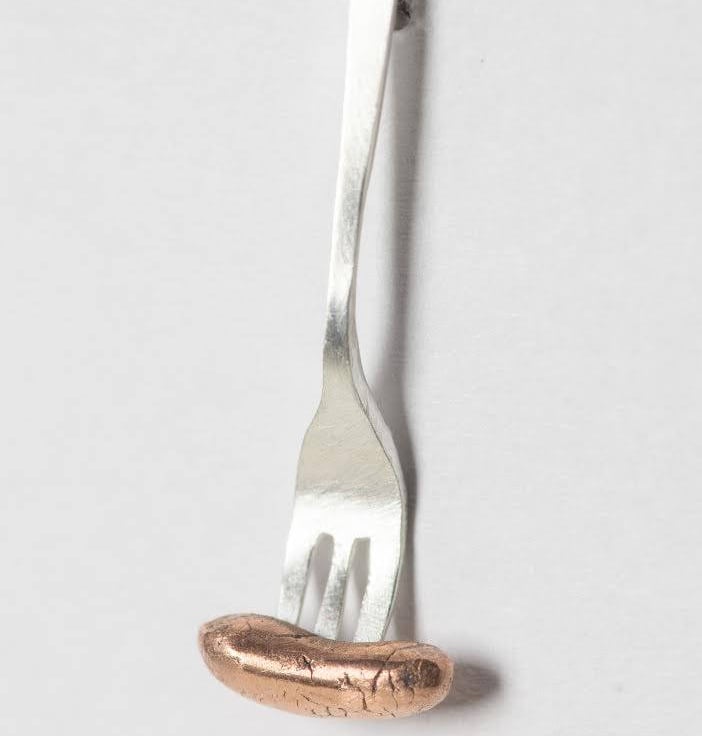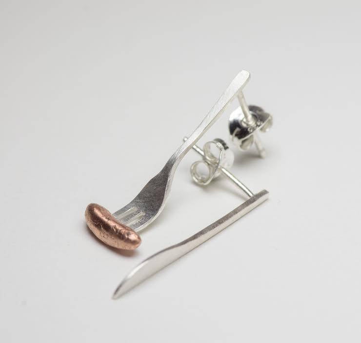Dainty sterling silver knife and fork earrings with copper sausage!