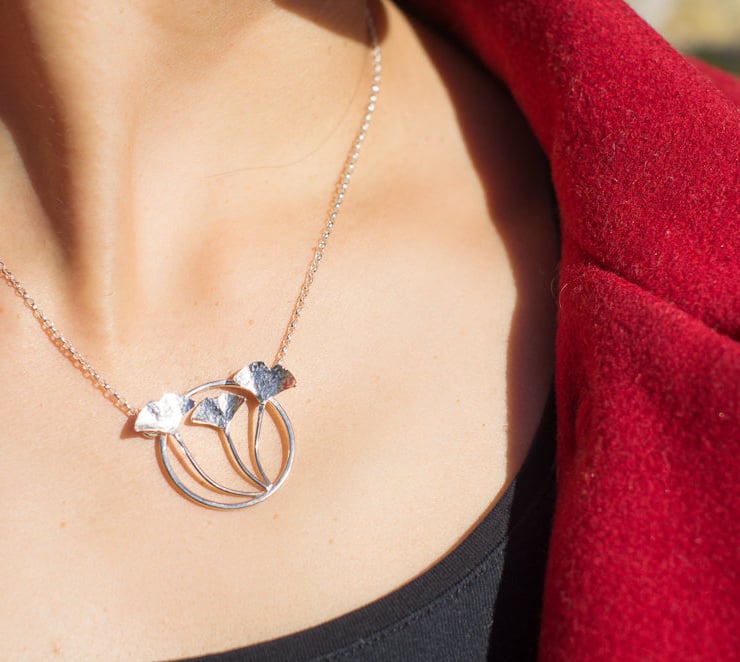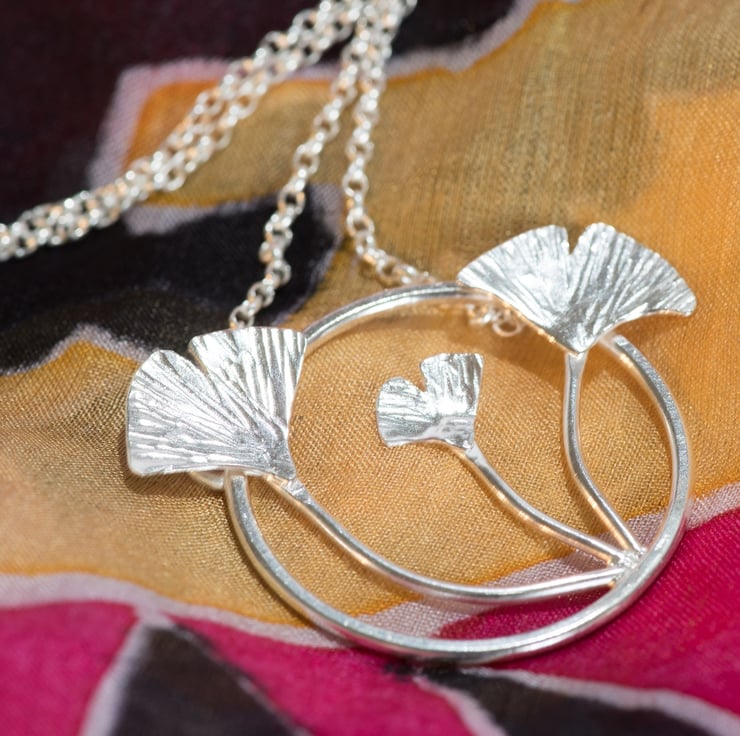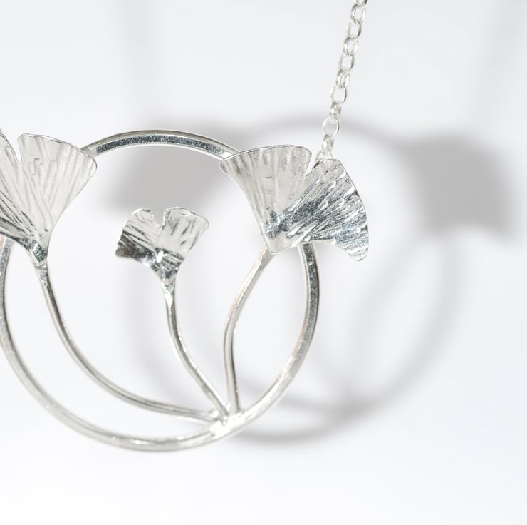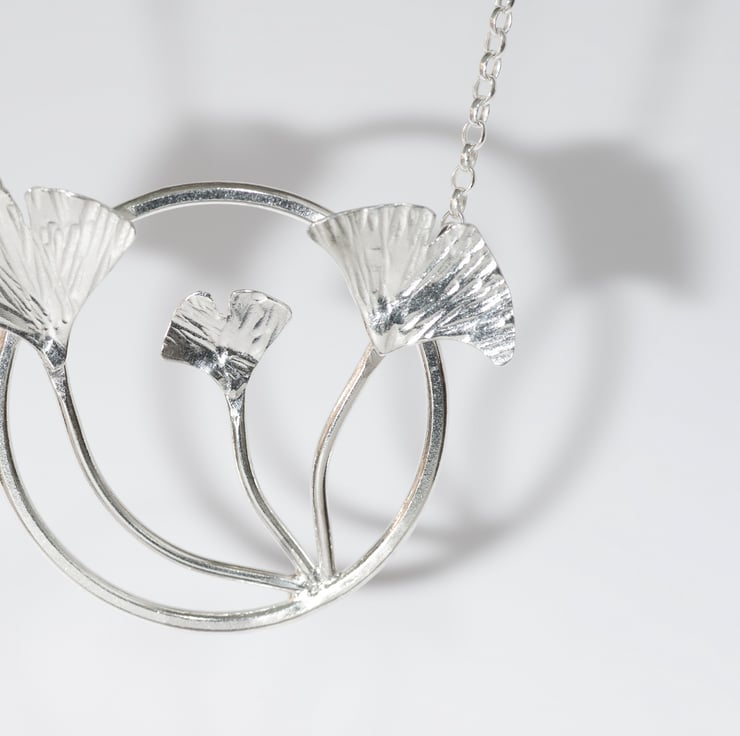 This stunning silver pendant necklace contrasts slender gingko stems and fan-like leaves with a circle of strength.